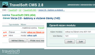 - byl doplněn modul odkazující na jiný článek v CMS, vložený článek se renderuje tak, že na místo, kam byl modul s odkazem vložen se renderují všechny moduly vloženého článku. Toto umožňuje např. tvorbu knihovny modulů, na které se lze odkázat z více různých článků.